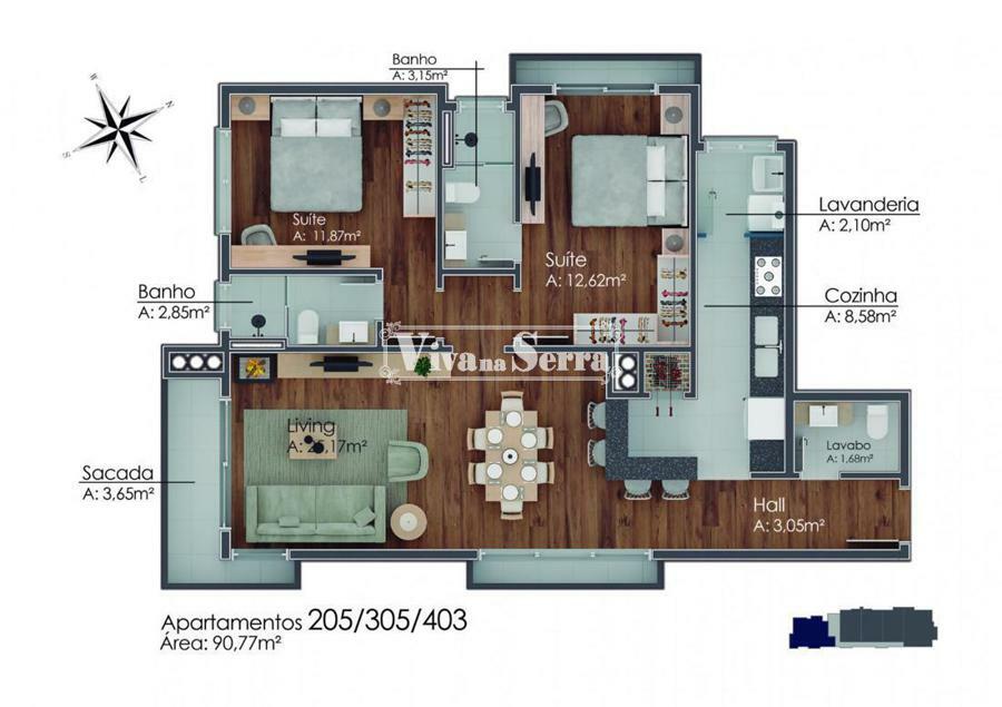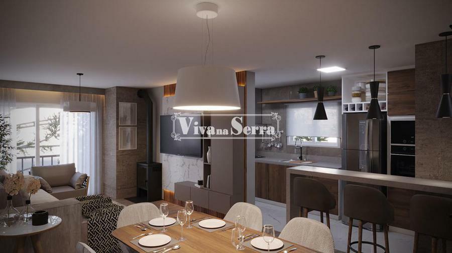 A Imobiliária Viva está oferecendo um apartamento em Gramado, RS, com uma área privativa de 90,77m². O imóvel possui: