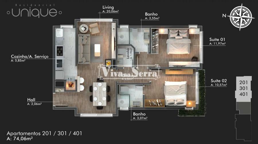 O empreendimento localizado no Centro de Gramado/RS é composto por 07 unidades, cada uma delas com 02 suítes. Além dessas, há também uma cobertura que possui 01 suíte. Todos os apartamentos contarão com 01 lavabo, cozinha integrada com área de serviço e churrasqueira, living com lareira, esquadrias pretas em PVC com vidros duplos, rebaixo em gesso, massa corrida nas paredes, piso aquecido nos banheiros, piso vinílico e porcelanato.