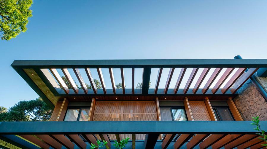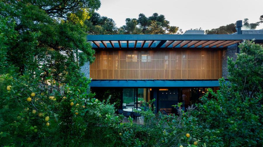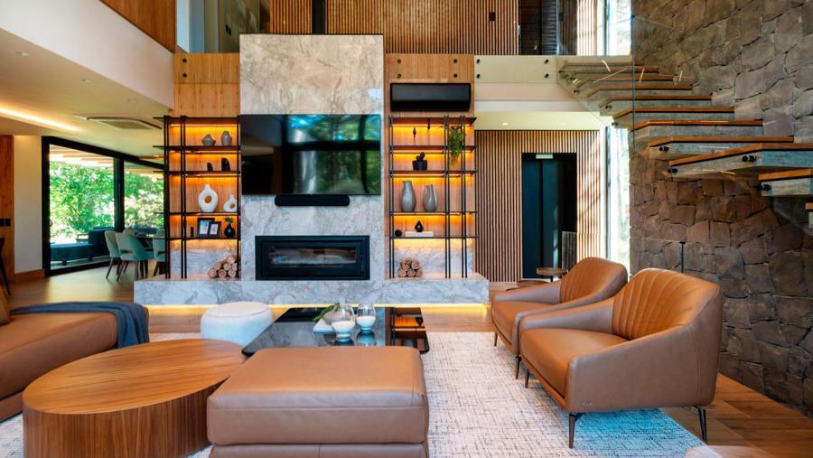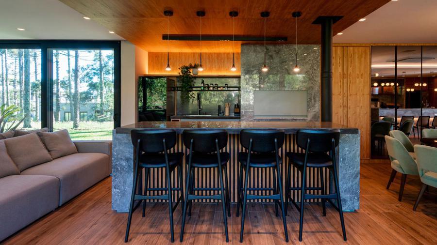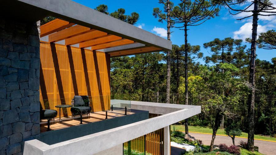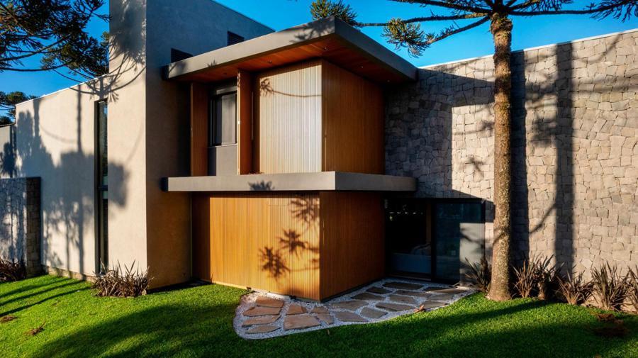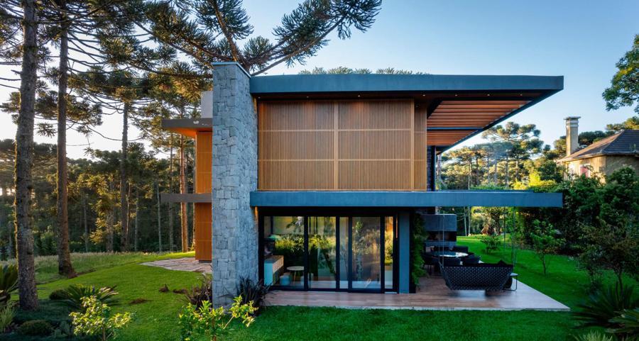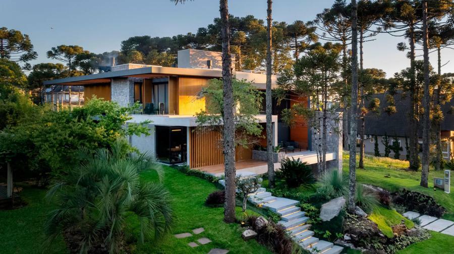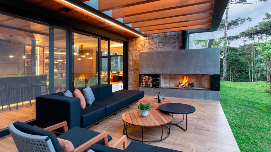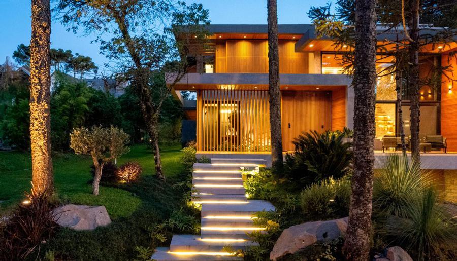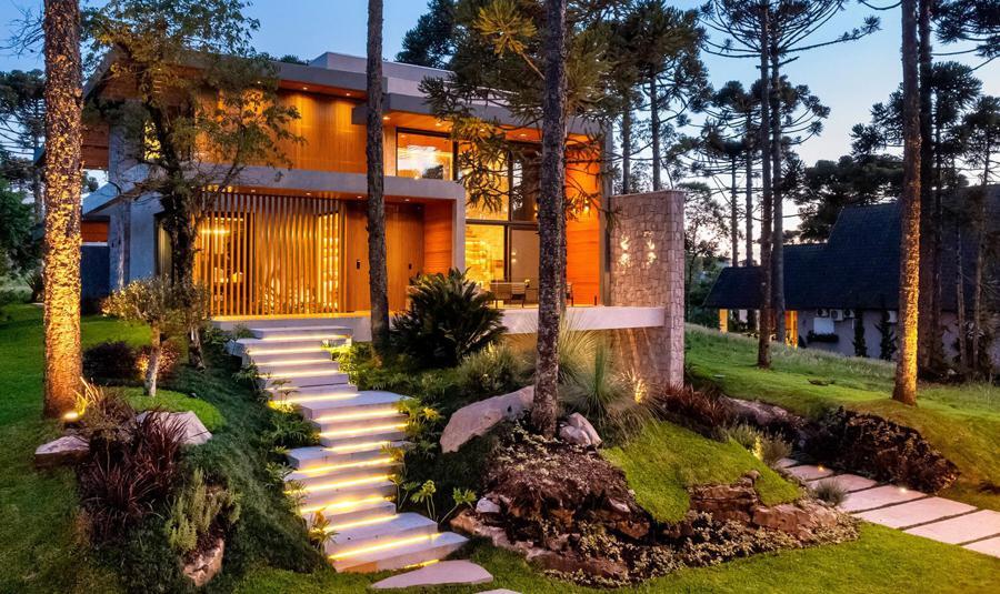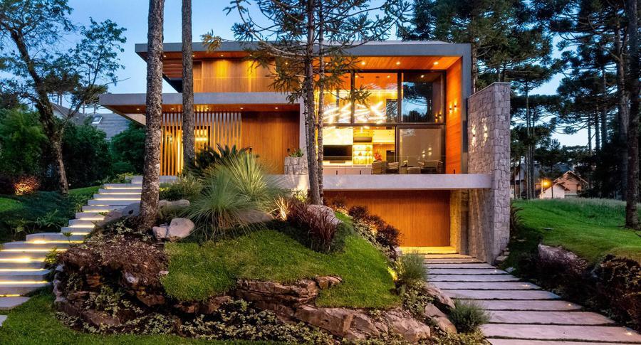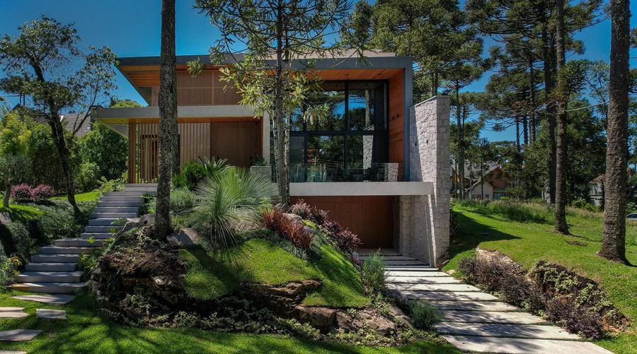 Elementos próprios da Serra Gaúcha, como a madeira e a pedra basalto, compõem com esta deslumbrante casa localizada em Gramado.